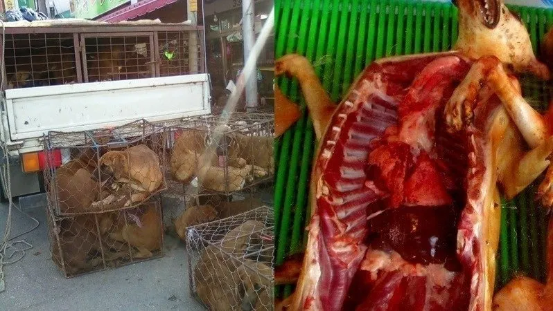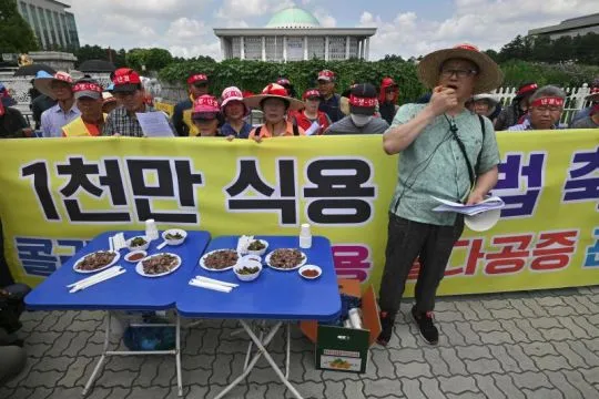 เกษตรกรชาวเกาหลีผู้เลี้ยงหมาเพื่อเป็นอาหารประท้วงคัดค้านกลุ่มสิทธิสัตว์ที่ต้องการให้รัฐบาลเกาหลีออกกฎหมายห้ามบริโภคเนื้อสุนัข พวกเขาประท้วงล้อมอาหารที่ทำจากเนื้อสุนัขพร้อมชวนชิมและแจกใบปลิวเกี่ยวกับประโยชน์ของการบริโภคเนื้อสุนัขด้วย