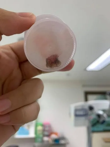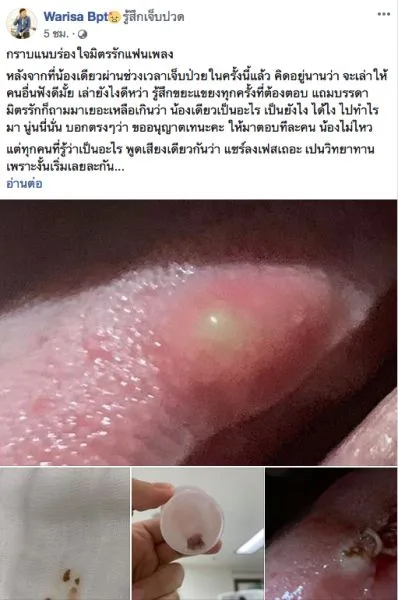 หมอแจ้งว่า จะส่งตรวจแล็บนะ ดูแล้วไม่น่าใช่เนื้อร้ายอะไร แต่เดี๋ยวมาดูผลกันอีกที วันนั้นก็กลับบ้านไปแบบ ลั้นลา หายแล้ว แต่ก้อกังวลเล็กน้อยว่ามันคืออะไร เอารูปโชว์แม่ว่าเนี่ย มันไม่ใช่ร้อนในแบบที่แม่บอกนะ 555 ซึ่งกรีดรอบนี้ ไม่เจ็บเท่าไหร่สองวันหายเจ็บละ