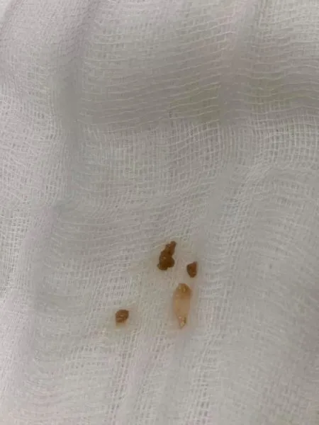 หลังจากเตรียมอุปกรณ์ในห้องผ่าตัดเล็กเสร็จ ก็เริ่มกระบวนการ แต่ระหว่างที่ทำ หมอบอกว่า เออ แปลกมาก มันไม่ใช่หนองอ่ะ แต่มันเป็นถุง (ถุงสีขาวๆในรูป ลักษณะแบบเม็ดข้าวสารแต่ใหญ่กว่า)
