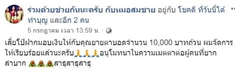 เสี่ยโป้ฝากมอบเงินให้กับคุณยายตาบอดจำนวน 10,000 บาทถ้วน ผมจัดการให้เรียบร้อยแล้วนะครับอนุโมทนาในความเมตตาต่อผู้คนที่ยากลำบาก สาธุสาธุสาธุ