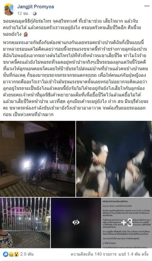 แล้วคนข้างบ้านคนนั้นที่ก่อเหตุ ก็เอาของมาทุบรถ จนกระจกรถแตก ทุบรถเพื่อให้คนแก่กับผู้หญิงลงมาจากรถคืออะไรเราไม่เข้าใจ มันรุนแรงขนาดนั้นเลยหรอ ไม่อยากจะคิดเลยว่าลูกอยู่ในรถจะเป็นยังไง แล้วตอนนี้ยังจับไม่ได้จะอยู่กันยังไง เสียใจกับลูกน้องด้วยนะคะ เจ้าหน้าที่มูลนิธิเค้าพยายามเต็มที่เพื่อยื้อชีวิตไว้แล้วแต่ยื้อไม่ได้ แล้วมาเสียชีวิตหน้าบ้าน เลวที่สุด ลูกเมียเค้าจะอยู่ยังไง ฝาก สน.มีนบุรี ด้วยนะคะ ขนาดรถน้องกำลังขับเข้ามายังวิ่งเข้ามาอาละวาด จนต้องรีบถอยรถอออกก่อน เป็นห่วงคนที่บ้านมาก”