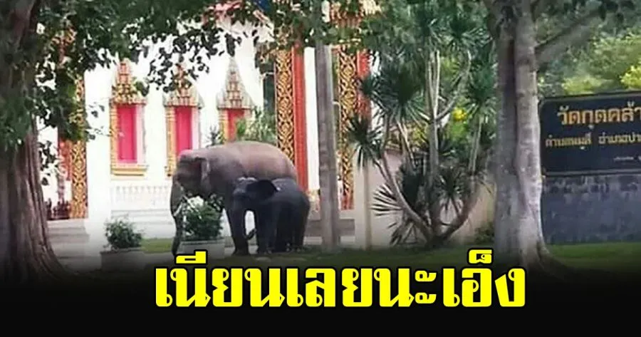 พระ เณร กระเจิง ช้างป่าบุกเข้าวัด ตีเนียนยืนนิ่งคู่รูปปั้นช้าง