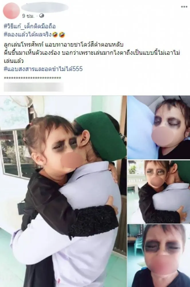 ตามที่สื่อสังคมออนไลน์แชร์ภาพเด็กหญิงคนหนึ่งทาอายแชโดว์สีดำ โดยระบุว่า เป็นวิธีที่สอนลูกหากไม่อยากให้ติดโทรศัพท์ ตื่นมาลูกไม่เล่นโทรศัพท์อีกเลยเพราะกลัวขอบตาดำ ซึ่งมีผู้แสดงความคิดเห็นกันเป็นจำนวนมาก ตั้งแต่มุมขำขันไปจนถึงมุมสงสารสภาพจิตใจเด็ก และอดคิดไม่ได้ว่าเป็นวิธีการสอนที่ถูกต้องหรือไม่ จะมีผลกับตัวเด็กในอนาคตอย่างไร