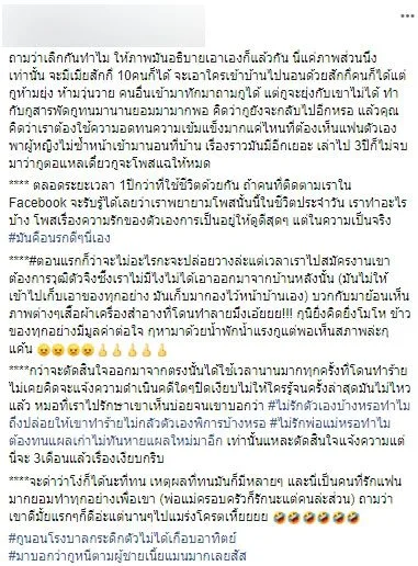 เรื่องราวมันมีอีกเยอะ เล่าไป 3 ปี ก็ไม่จบ มาว่าเราตอแหลเดี๋ยวเราจะโพสต์แฉให้หมด ตลอดระยะเวลา 1 ปีกว่า ที่ใช้ชีวิตด้วยกัน ถ้าคนที่ติดตามเราในเฟซบุ๊ก จะรับรู้ได้เลยว่า เราพยายามโพสต์นั่นนี่ ในชีวิตประจำวัน เราทำอะไรบ้าง โพสต์เรื่องความรักของตัวเอง การเป็นอยู่ให้ดูดีสุดๆ แต่ในความเป็นจริง มันคือ นรกดีๆนี่เอง