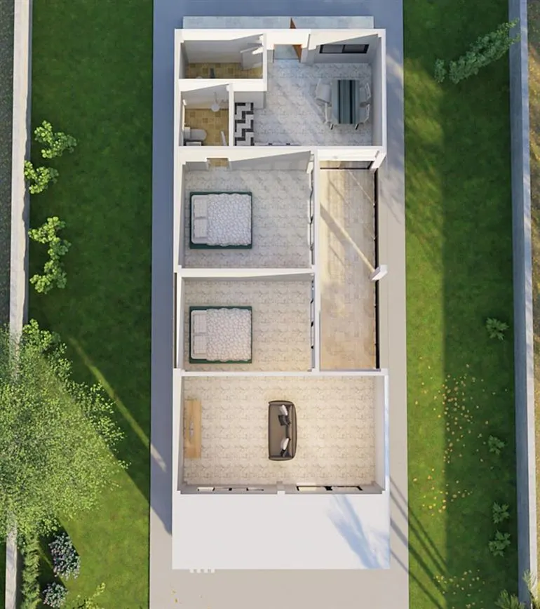 แบบบ้านชั้นเดียว ทรงจั่วหน้าแคบแนวยาว 2 ห้องนอน 2 ห้องน้ำ เหมาะกับคนง่ายๆ