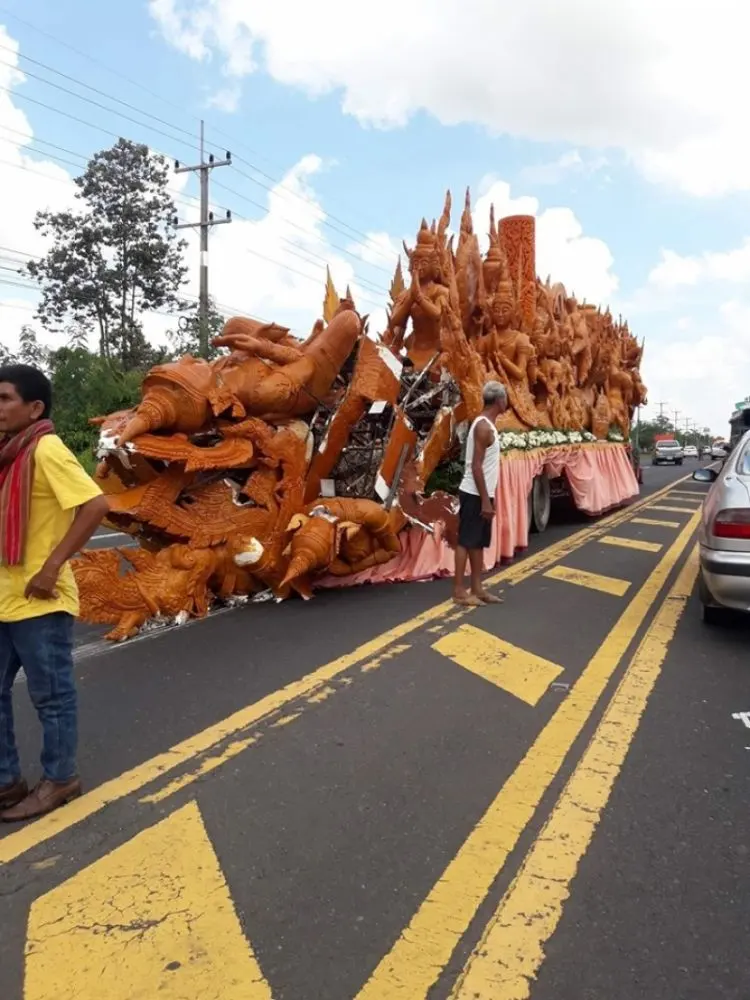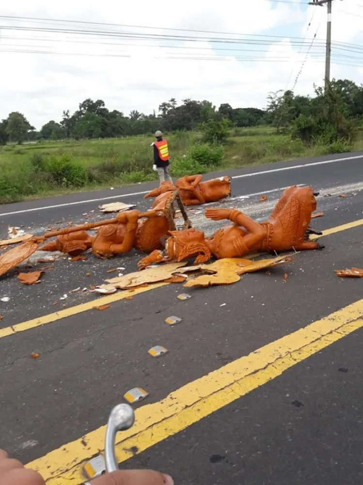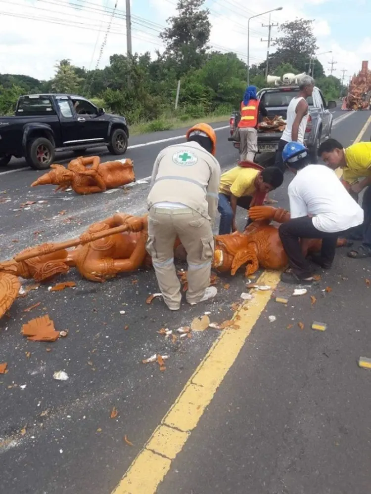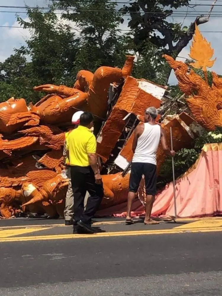 ขณะนี้อยู่ระหว่างรอช่างมาประเมินสถานการณ์ ก่อนจะเคลื่อนขบวนต่อไปยังจุดหมาย พร้อมระดมทีมช่าง ช่วยกันซ่อม ซึ่งเป็นภาพที่ทำเอาหลายคนสะเทือนใจ เพราะกว่าจะแกะสลักได้สวยงามวิจิตรขนาดนี้ ต้องใช้ระยะเวลาหลายเดือน