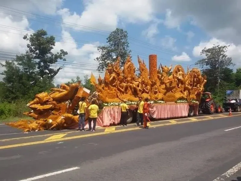 รถขบวนเทียน เกิดอุบัติเหตุ จนต้นเทียนพังเสียหาย ก่อนเข้าประกวด