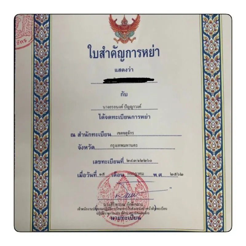 จากกรณี “อรอนงค์ ปัญญาวงศ์” นางสาวไทยปี 2535 ได้โพสติไอจีว่าเธอได้หย่าขาดกับสามีแล้ว พร้อมทั้งโพสต์ภาพใบหย่า ลงวันที่ 15 ก.ค.62 ที่สำนักงานเขตจตุจักร