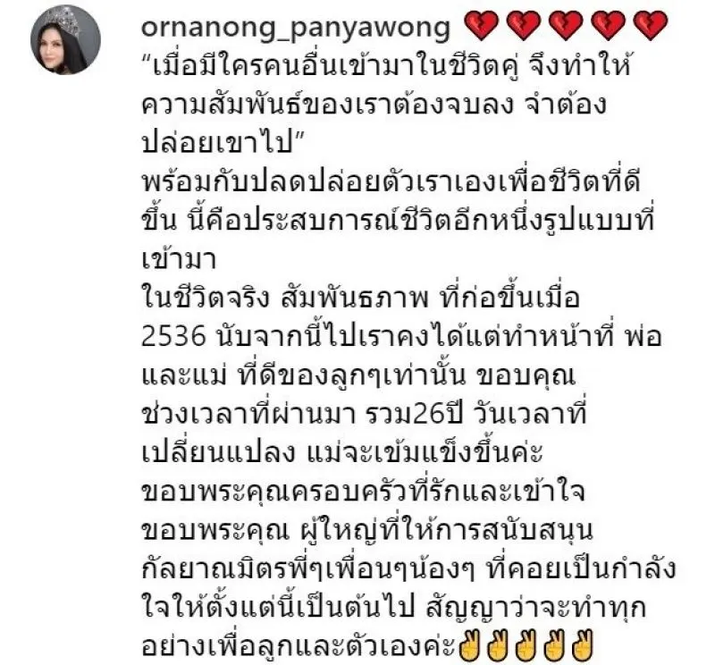 โดยระบุข้อความว่า “เมื่อมีใครคนอื่นเข้ามาในชีวิตคู่ จึงทำให้ความสัมพันธ์ของเราต้องจบลง จำต้องปล่อยเขาไป” พร้อมกับปลดปล่อยตัวเราเองเพื่อชีวิตที่ดีขึ้น นี้คือประสบการณ์ชีวิตอีกหนึ่งรูปแบบที่เข้ามาในชีวิตจริง สัมพันธภาพ ที่ก่อขึ้นเมื่อ 2536 นับจากนี้ไปเราคงได้แต่ทำหน้าที่ พ่อและแม่ ที่ดีของลูกๆ เท่านั้น ขอบคุณ