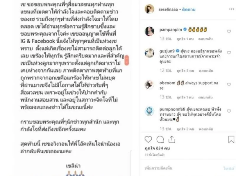 สาวเซลิน่า ใจจะขาด ยังไม่สามารถติดต่อลูกได้ตั้งแต่เกิดเรื่องถูกสามีชิงตัวลูกน้อยไปจากอก และต้องนอนร้องไห้ทุกคืน โดยล่าสุด เจ้าตัวโพสต์ข้อความ ขอลูกคืนว่า “เซขอขอบพระคุณพี่สื่อมวลชนทุกท่านทุกแขนง ที่เมตตาให้กำลังใจและคอยติดตามข่าวของเซ รวมถึงทุกๆ ท่านที่ส่งกำลังใจมาให้โดยตลอด เซได้อ่านทุกข้อความรู้สึกซาบซึ้งและขอบพระคุณจากใจค่ะ เซขออนุญาตใช้พื้นที่ IG & Facebook นี้แจ้งให้ทุกๆ คนที่เป็นห่วงเซทราบ ตั้งแต่เกิดเรื่องเซไม่สามารถติดต่อลูกได้เลย เซร้องไห้ทุกวัน รู้สึกเครียดมากและที่สำคัญเซเป็นห่วงลูกมากๆ เพราะตั้งแต่เกิดมาเราไม่เคยห่างจากกันเลย