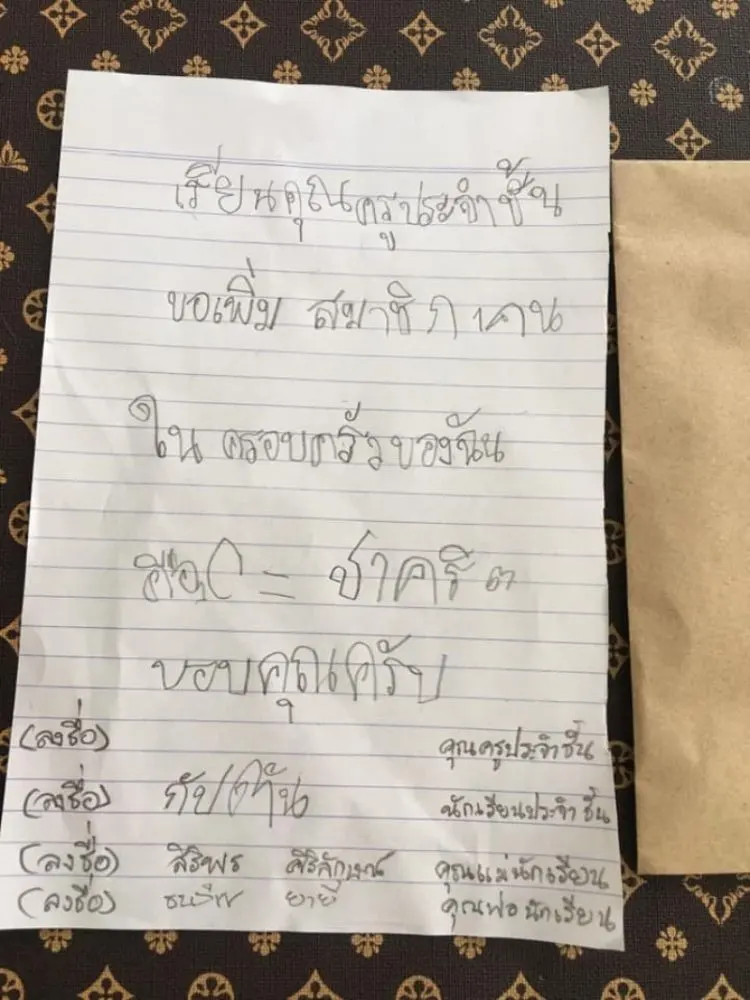 น่ารักมาก เด็กชายเขียนถึงคุณครูประจำชั้น ขอเพิ่ม พี่ชาคริต เป็นสมาชิกในบ้าน