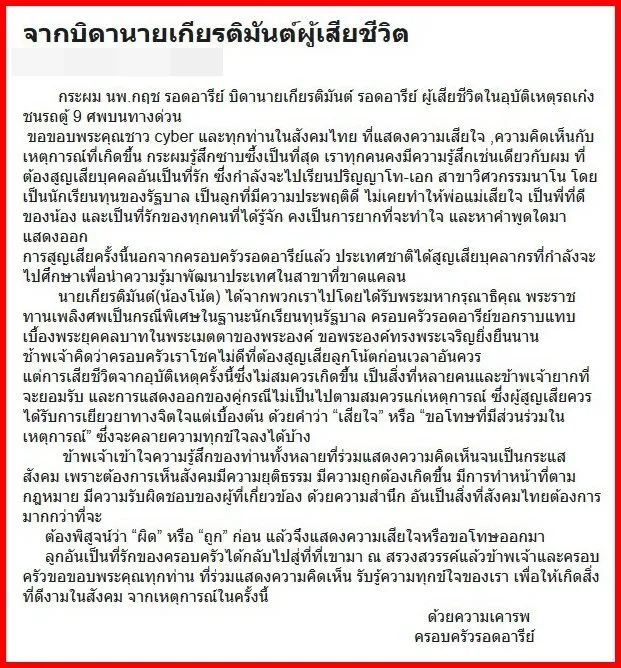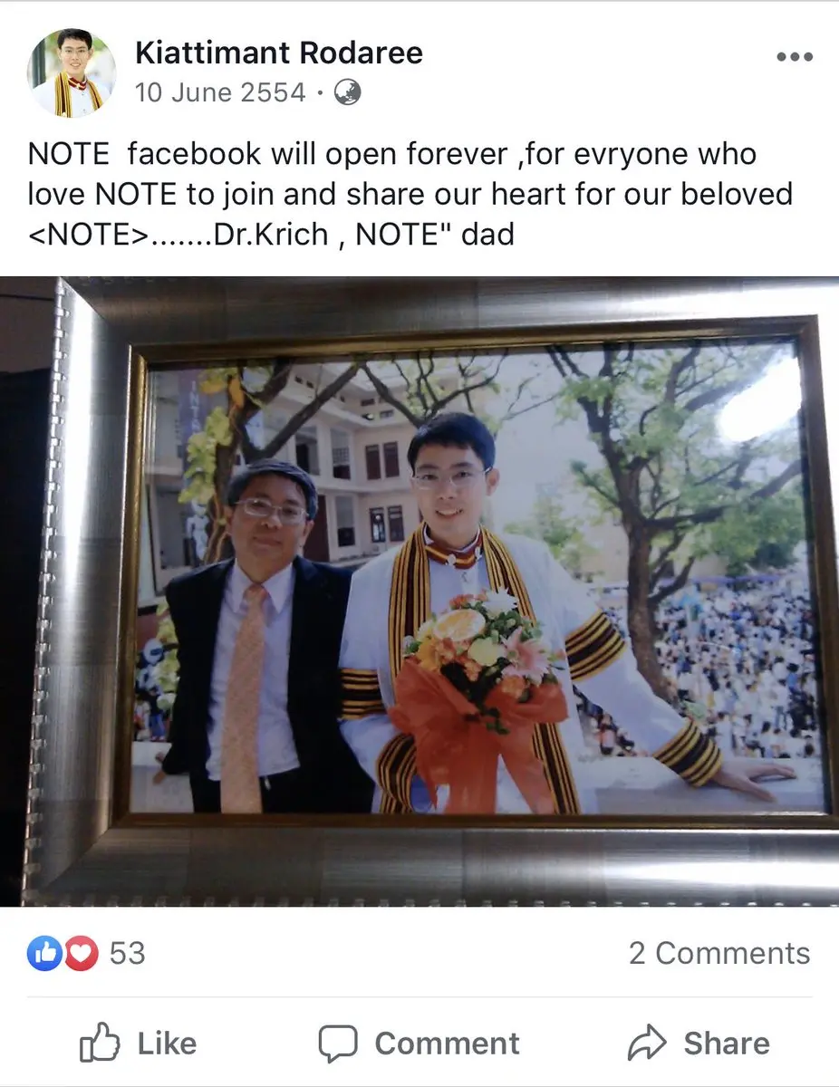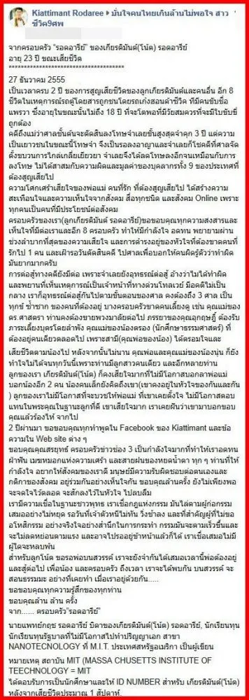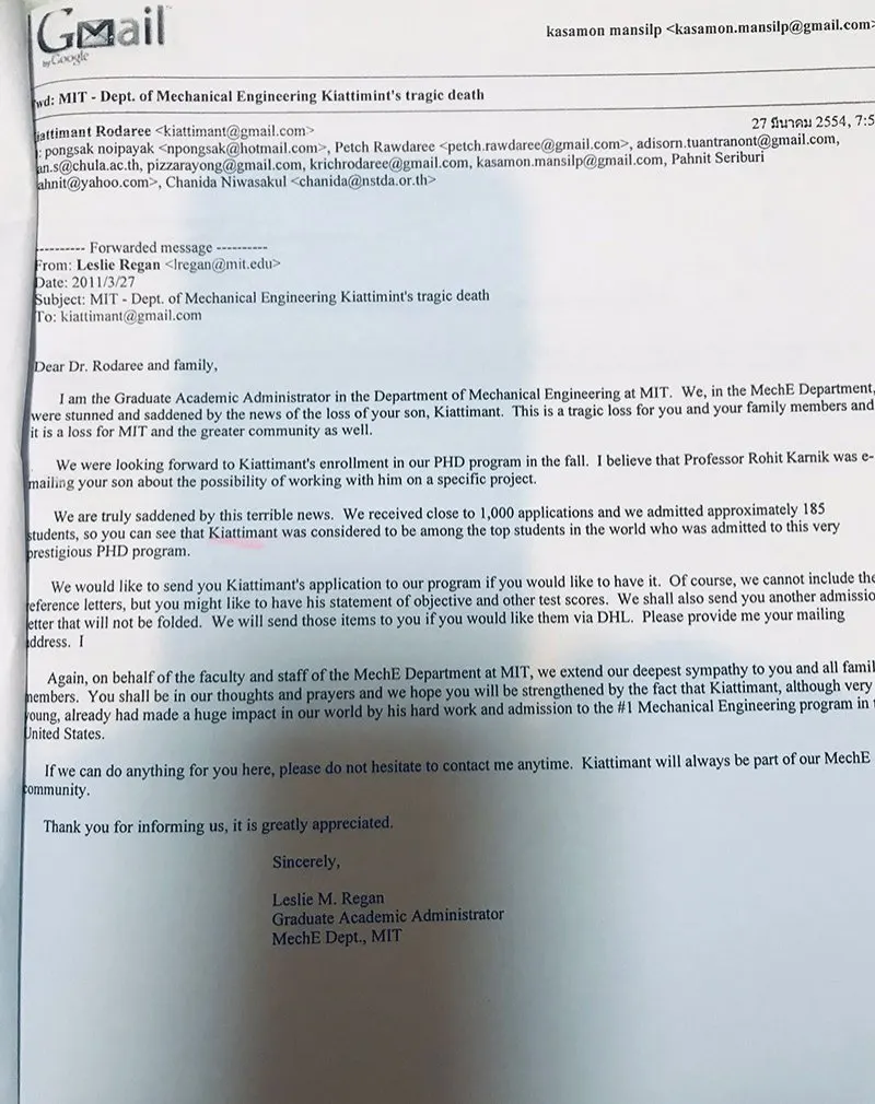 ทั้งนี้ทาง M.I.T.ได้ส่งจดหมายมาหาครอบครัวน้องโน๊ต ซึ่งทางด้านทวิตเตอร์ lakkhana_thai ได้โพสต์ข้อความพร้อมภาพจดหมายว่า 1ใน9ศพคือน้องโน๊ต จบวิศวะจุฬา ด้วยเกรด 3.9 ได้ทุนต่อโทเอกวิศวะที่ MIT ที่มีชื่อระดับโลก คุณพ่อได้รับเมลแสดงความเสียใจจาก MIT ที่กำลังรอน้องไปเรียน เสียดายคนเก่ง