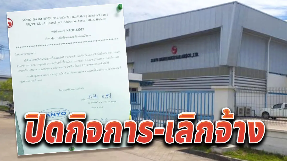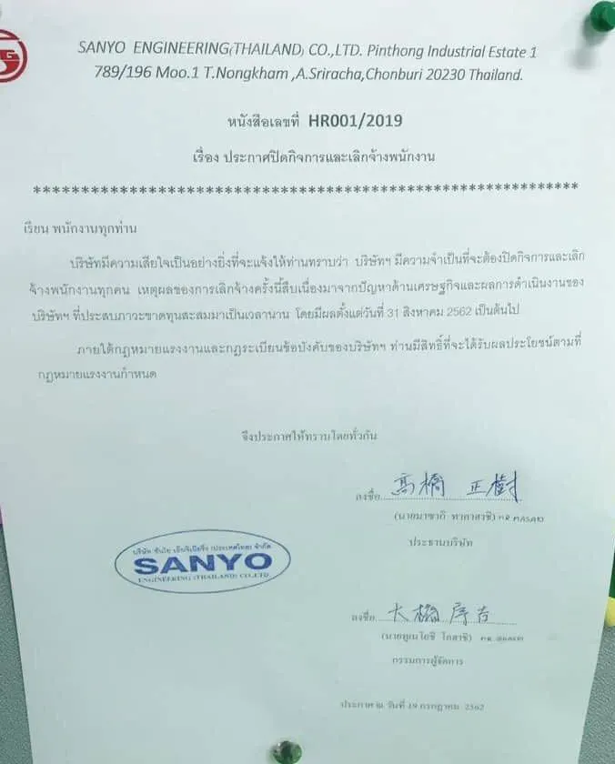 ผู้บริหาร บริษัท ซันโย เอ็นจิเนียริ่ง (ประเทศไทย) จำกัด ในอำเภอศรีราชา จังหวัดชลบุรี ได้สั่งให้มีการเผยแพร่ประกาศแจ้งปิดกิจการและเลิกจ้างพนักงาน โดยเนื้อหาประกาศแจ้งปิดกิจการและเลิกจ้างพนักงาน ระบุลงนามโดย นายเทซสีโซะ ยามาคาวา ประธานบริษัท แจ้งว่า