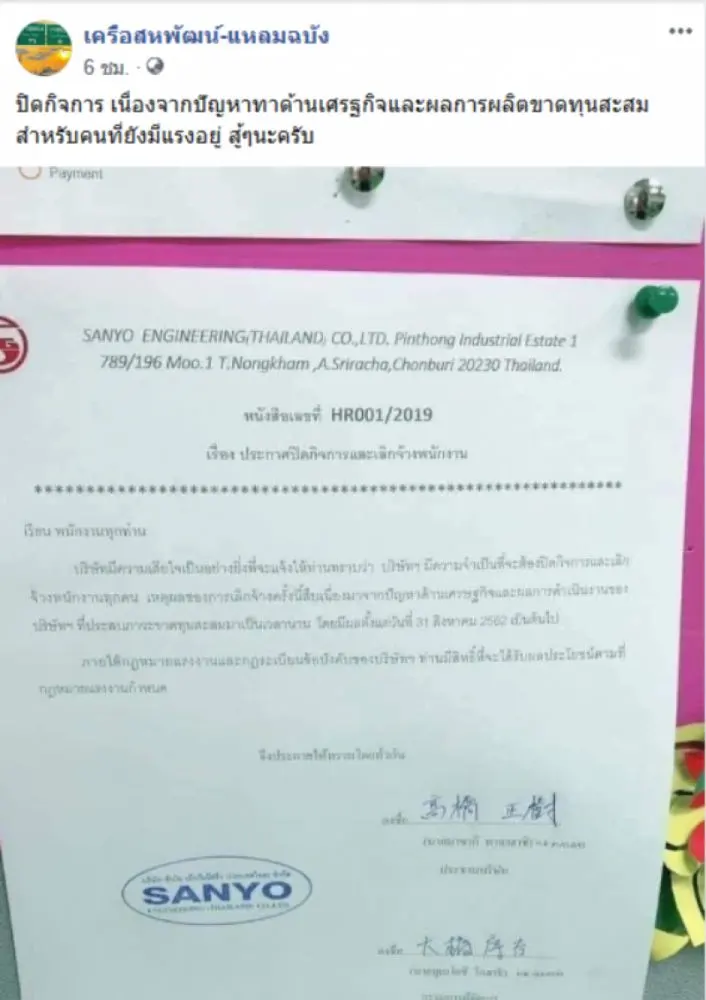 จากกรณีผู้ใช้เพจเฟซบุ๊กชื่อ เครือสหพัฒน์-แหลมฉบัง ได้โพสต์ข้อความพร้อมรูปใบประกาศระบุว่า ปิดกิจการ เนื่องจากปัญหาทาด้านเศรฐกิจและผลการผลิตขาดทุนสะสม สำหรับคนที่ยังมีแรงอยู่ สู้ๆนะครับ