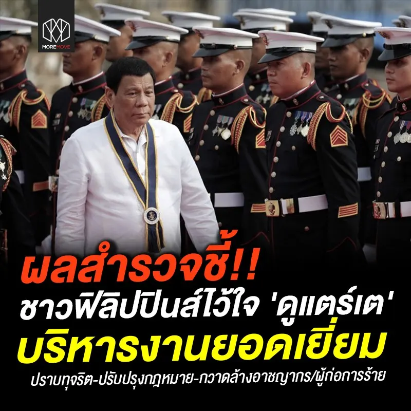 ขึ้นแท่นความนิยม!!! โพลสำรวจความคิดเห็น โดย พัลส์ เอเชีย (Pulse Asia) หน่วยงานสำรวจความคิดเห็นของประชาชนในฟิลิปปินส์ ระบุว่า ชาวฟิลิปปินส์แสดงความเห็นว่า โรดรีโก ดูแตร์เต ประธานาธิบดี บริหารงานได้อย่างยอดเยี่ยม โดยเขาได้รับความไว้วางใจตลอด 3 ปี ของการดำรงตำแหน่งประธานาธิบดี จากวาระที่ยาวนานทั้งหมด 6 ปี เผยชัด ร้อยละ 85 ของผู้ตอบแบบสอบถามไว้วางใจผู้นำประเทศวัย 74 ปีผู้นี้ โดยเฉพาะชาวฟิลิปปินส์กลุ่มที่ยากจนที่สุดในประเทศไว้วางใจดูแตร์เตมากที่สุด นอกจากนี้ การสำรวจยังชี้ว่าดูแตร์เตได้รับความไว้วางใจจากคนส่วนใหญ่ทั่วทั้งภูมิภาค รวมถึงกลุ่มทางเศรษฐกิจและสังคมต่างๆ