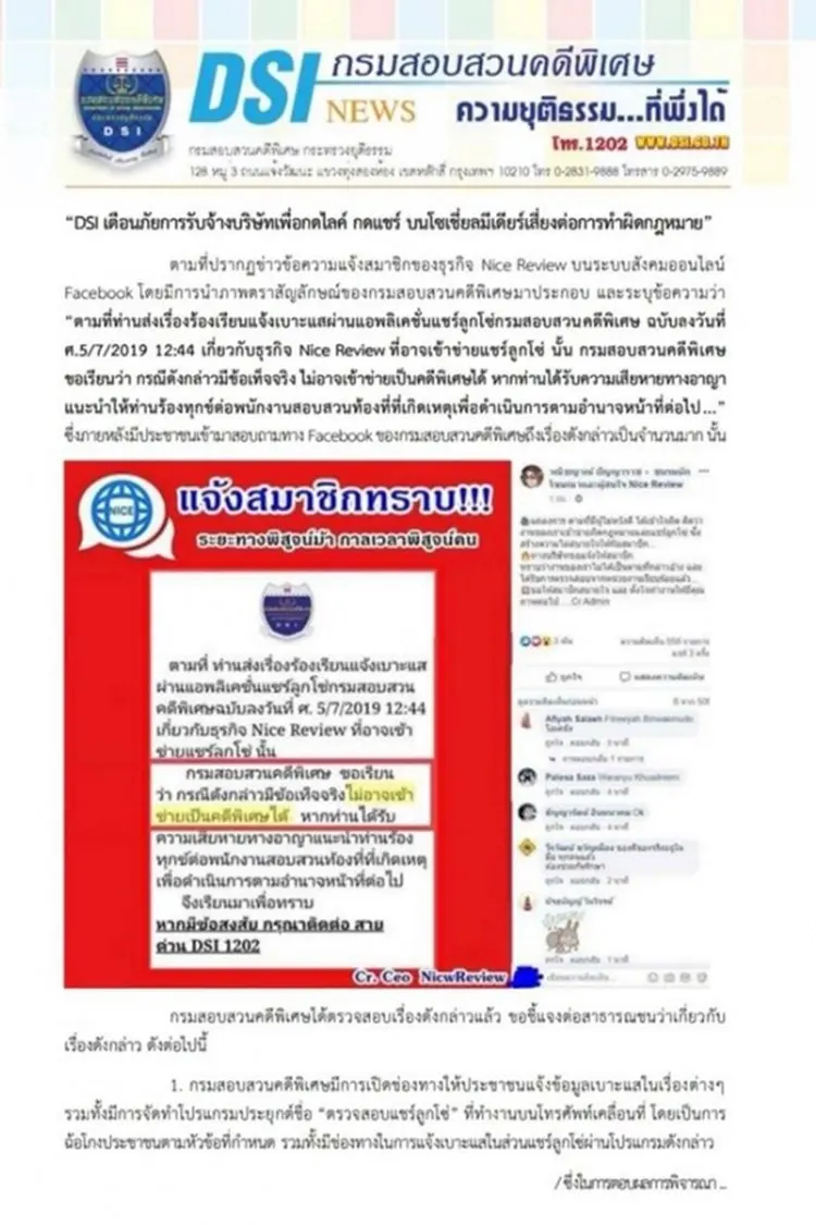 จากกรณี มีข้อความแจ้งสมาชิกของธุรกิจNice Reviewบนเพจเฟซบุ๊ก โดยมีการนำภาพตราสัญลักษณ์ของกรมสอบสวนคดีพิเศษมาประกอบและระบุข้อความในทำนองว่าธุรกิจNice Reviewไม่อาจเข้าข่ายเป็นคดีพิเศษ ทำให้หลายฝ่ายเกิดความสงสัยว่าหน่วยงานของรัฐทำไมถึงกล้ารับรองในธุรกิจเช่นนี้ ล่าสุด พ.ต.ต.วรณัน ศรีล้ำ รองโฆษกกรมสอบสวนคดีพิเศษ ชี้แจงว่าดีเอสไอเปิดช่องทางให้ประชาชนแจ้งข้อมูลเบาะแสในเรื่องต่างๆ