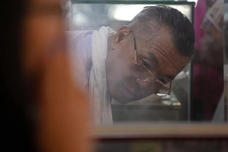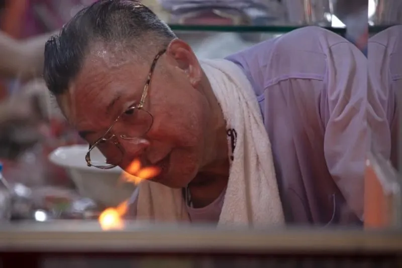 “วันนี้เปิดร้านวันแรก เพื่อน ๆ ก็มาอุดหนุนกันเยอะ นอกเหนือจากกำลังใจที่มีให้กันเสมอมาแล้ว หลายคนก็อยากจะมาชิมราดหน้าฝีมือผมด้วยนั่นล่ะ อย่าว่าคุยเลย” คุณสมชายพูด พร้อมระเบิดเสียงหัวเราะอย่างอารมณ์ดี กับกลุ่มเพื่อนฝูง ที่ล้อมวงทานราดหน้าเป๋าฮื้อ ชามโต กันอย่างสำราญ พร้อมกับผู้หญิงรุ่นราวคราวเดียวกันอีกคน คือ คุณจารุนันท์ ผู้เป็นภรรยา ที่ยืนยิ้มและร่วมวงสนทนาด้วยใบหน้าที่ยิ้มแย้ม พร้อมกระชับกระเป๋าเก็บสตางค์ให้อยู่กับตัว พร้อมกับพูดแบบอารมณ์ดีว่า “ขายวันแรกก็รวยเลย” ขณะคุย ผู้เขียนเหลือบเห็นรอยไหม้บนใบหน้า ของคุณสมชาย อดไม่ได้ที่จะถามว่าเกิดอะไรขึ้น
