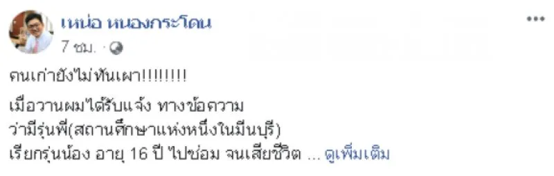 วันที่ 22 ก.ค. เพจผู้ใช้เฟซบุ๊กชื่อ เหน่อ หนองกระโดน ได้โพสต์ภาพผู้เสียชีวิต วัย 16 ปี พร้อมข้อความ ระบุว่า "คนเก่ายังไม่ทันเผา เมื่อวานผมได้รับแจ้ง ทางข้อความ ว่ามีรุ่นพี่(สถานศึกษาแห่งหนึ่งในมีนบุรี) เรียกรุ่นน้อง อายุ 16 ปี ไปซ่อม จนเสียชีวิต ซึ่งเป็นการเรียกไปซ่อมส่วนตัว ไม่เกี่ยวกับสถาบัน(อีกแล้ว)