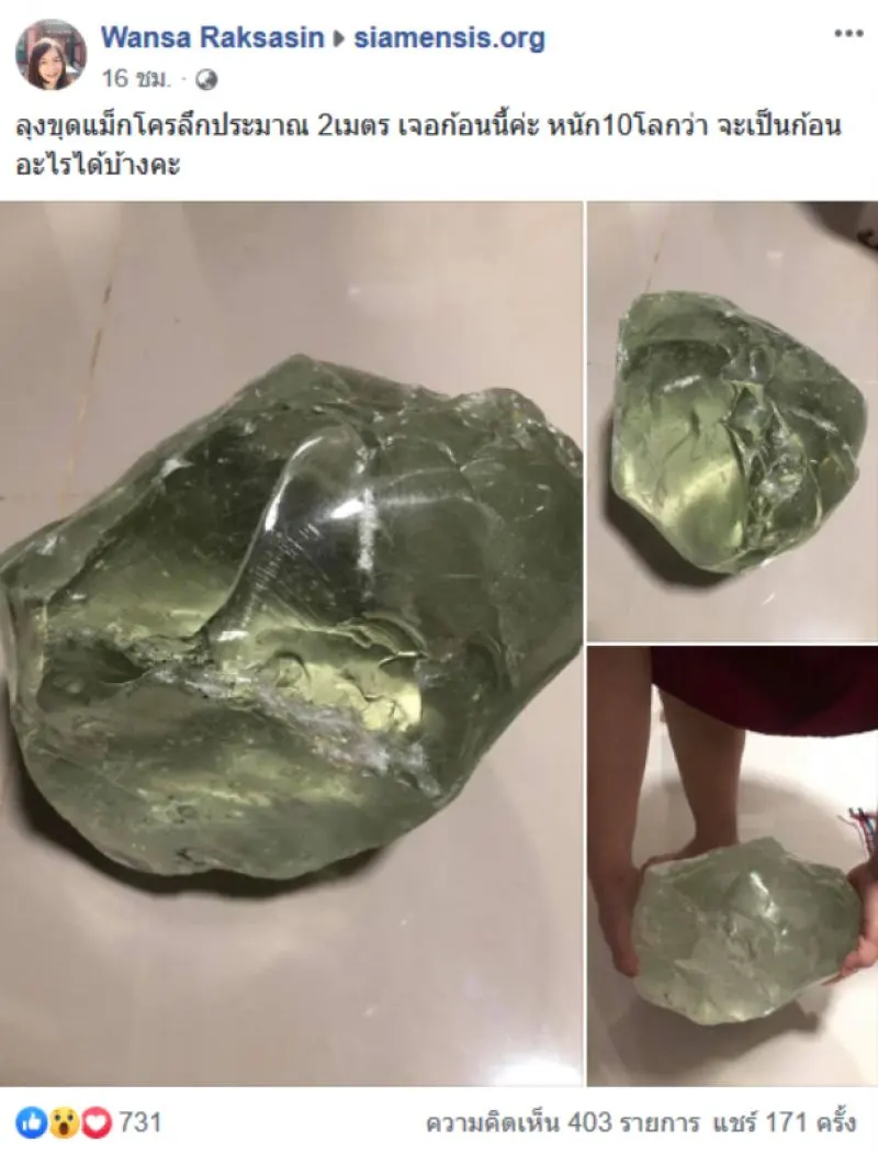 วันที่ 23 กรกฎาคม 2562 ผู้สื่อข่าวรายงานว่า โลกออนไลน์มีการแชร์เรื่องราวของผู้ใช้เฟซบุ๊กชื่อ Wansa Raksasin ได้โพสต์ภาพของหินแปลกที่ขุดพบโดยบังเอิญ ซึ่งระบุข้อความว่า ลุงขุดแม็กโครลึกประมาณ 2เมตร เจอก้อนนี้ค่ะ หนัก10โลกว่า จะเป็นก้อนอะไรได้บ้างคะ