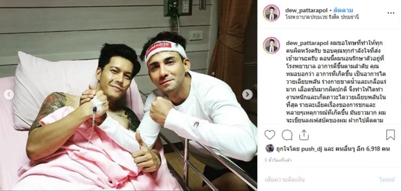 "dew_pattarapol ผมขอโทษที่ทำให้ทุกคนผิดหวังครับ ขอบคุณทุกกำลังใจที่ส่งเข้ามานะครับ ตอนนี้ผมนอนรักษาตัวอยู่ที่โรงพยาบาล อาการดีขึ้นตามลำดับ คุณหมอบอกว่า อาการที่เกิดขึ้น เป็นอาการไตวายเฉียบพลัน ร่างกายขาดน้ำและเกลือแร่มาก"