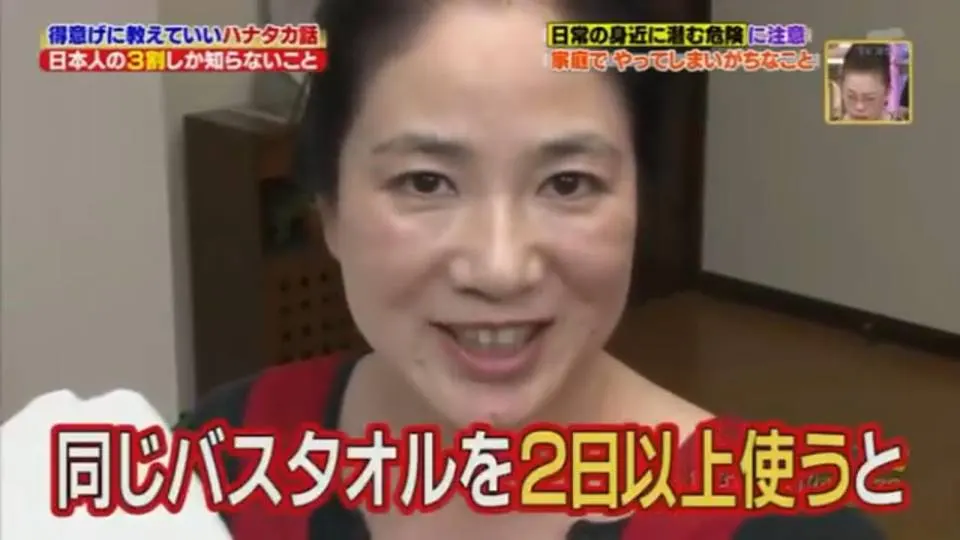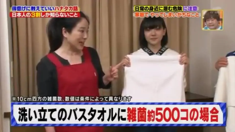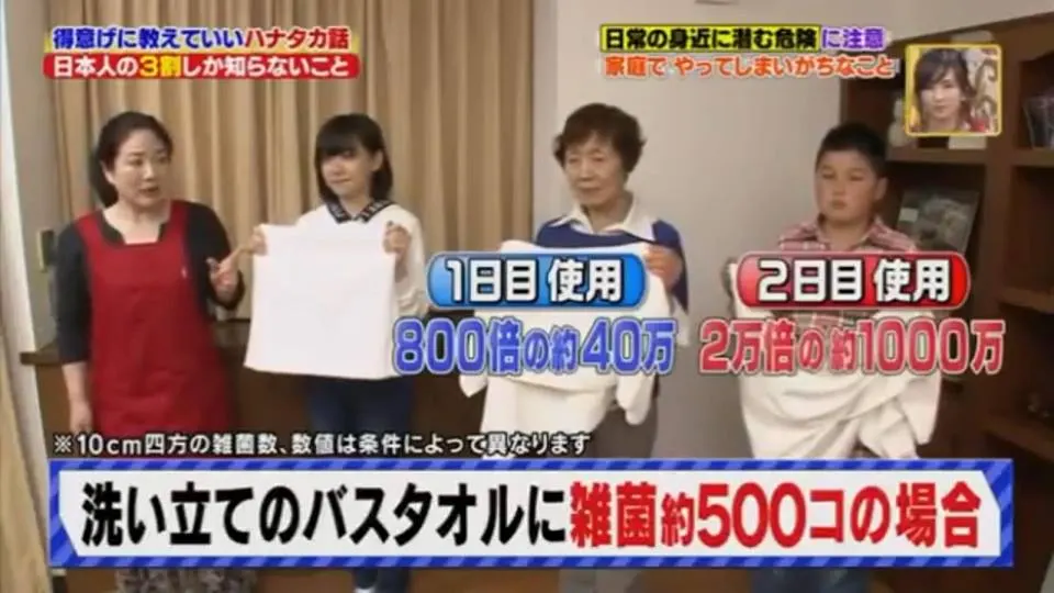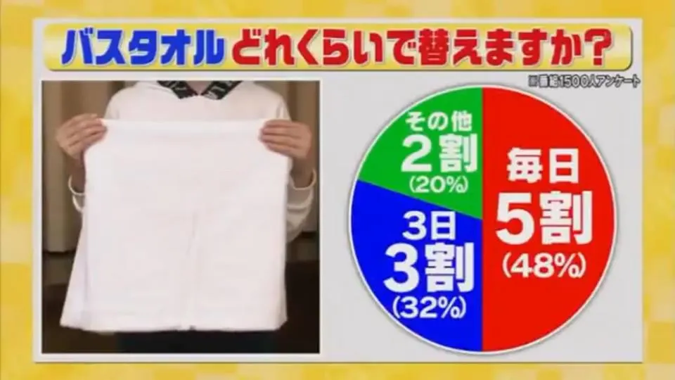 แต่สำหรับคนญี่ปุ่นส่วนใหญ่แล้ว เขาให้ความสำคัญกับการเปลี่ยนผ้าเช็ดตัวบ่อยๆ เพราะในผ้าเช็ดตัวจะมีเชื้อโรคสะสมอยู่มากมาย ซึ่งรายการหนึ่งของญี่ปุ่น ได้ยกประเด็นนี้ขึ้นมาเป็นคำถาม ปรากฏว่าผลการสำรวจ 48% เปลี่ยนผ้าเช็ดตัวกันทุกวันเลยทีเดียว และอีก 32% เปลี่ยนทุกๆ 3 วัน ซึ่งแน่นอนว่าพวกเขาถือว่าเปลี่ยนผ้าเช็ดตัวกันบ่อยมากๆ