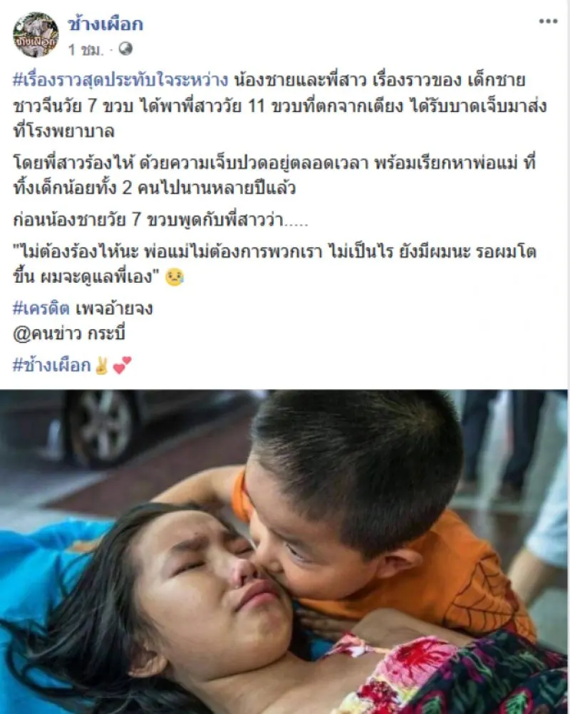 วันที่ 23 กรกฎาคม 2562 ผู้สื่อข่าวรายงานว่า โลกออนไลน์มีการแชร์เรื่องราวสุดเศร้าของผู้ใช้เพจเฟซบุ๊กชื่อ ช้างเผือก โดยระบุข้อความว่า #เรื่องราวสุดประทับใจระหว่าง น้องชายและพี่สาว เรื่องราวของ เด็กชายชาวจีนวัย 7 ขวบ ได้พาพี่สาววัย 11 ขวบที่หล่นจากเตียง ได้รับบาดเจ็บมาส่งที่โรงพยาบาล โดยพี่สาวร้องไห้ ด้วยความเจ็บปวดอยู่ตลอดเวลา พร้อมเรียกหาพ่อแม่ ที่ทิ้งเด็กน้อยทั้ง 2 คนไปนานหลายปีแล้ว ก่อนน้องชายวัย 7 ขวบพูดกับพี่สาวว่า "ไม่ต้องร้องไห้นะ พ่อแม่ไม่ต้องการพวกเรา ไม่เป็นไร ยังมีผมนะ รอผมโตขึ้น ผมจะดูแลพี่เอง" #เครดิต เพจอ้ายจง @คนข่าว กระบี่ #ช้างเผือก