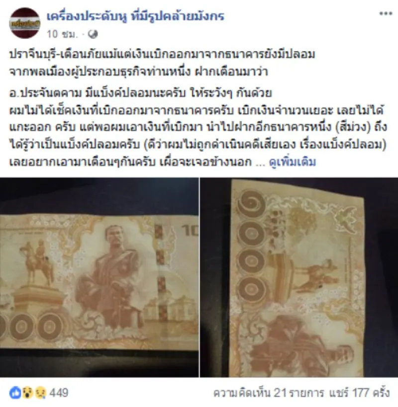 ปราจีนบุรี-เตือนภัยแม้แต่เงินเบิกออกมาจากธนาคารยังมีปลอม
