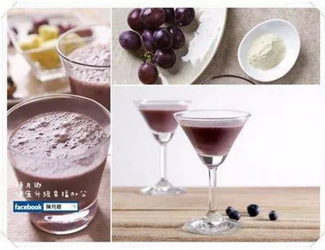 ส่วนผสม: กะหล่ำปลีสีม่วง 30 กรัม, บลูเบอร์รี่ 60 กรัม, แอปเปิ้ล 1ลูก , องุ่น 150 กรัม, ผลไม้จำพวกเปลือกแข็ง มีเมล็ดด้านใน 1 ช้อนโต๊ะ, น้ำต้มสุก 400 มล.