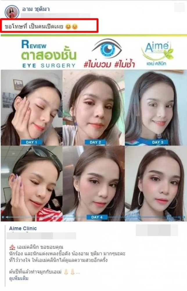 ยิ่งล่าสุดสุดนี้ นักร้องลุกทุ่งสาว อาม ชุติมา ที่ก่อนหน้านี้ เจ้าตัวก็พึ่งมีการทำจมูกไป และไม่นานมานี้ก็ได้ไปทำตาสองชั้นมาอีก พร้อมทั้งเปิดเผยเองว่าทำมา ไม่มีปิดบัง ด้วยการแชร์ภาพรีวิวการทำตาพร้อมกับแคปชั่นว่า ขอโทษที่ เป็นคนเปิดเผย