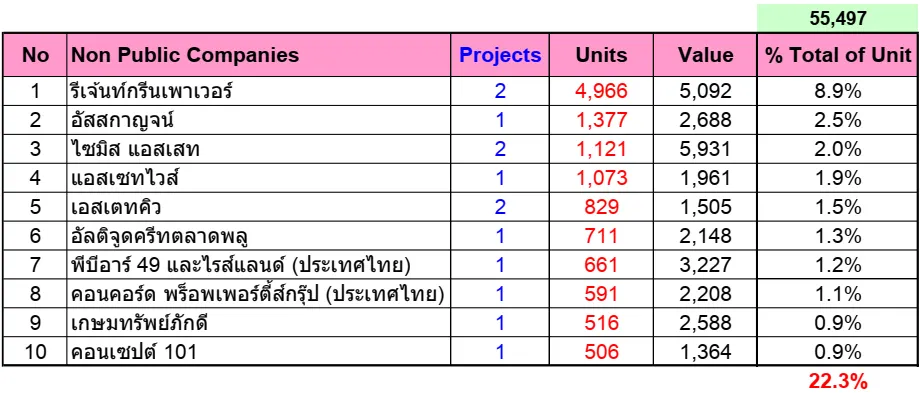 หากพิจารณาในส่วนของบริษัท จำกัด หรือบริษัททั่วไปที่อยู่นอกตลาดหลักทรัพย์ จะพบว่า อันดับ 1 คือ บริษัท รีเจ้นท์ กรีนพาวเวอร์ จำกัด มีการเปิดขายหน่วยขาย 4,966 หน่วย อันดับ 2 คือ บริษัท อัสสกาญจน์ จำกัด จำนวน 1,377 หน่วย และอันดับ 3 คือ บริษัท ไซมิส แอสเสท จำกัด จำนวน 1,121 หน่วย ถ้านับจำนวนหน่วยรวมที่เปิดใหม่ครึ่งปีแรก 2562 ก็จะพบว่า 3 บริษัทนี้ เปิดตัวเป็นสัดส่วน 8.9%, 2.5% และ 2.0% ตามลำดับ