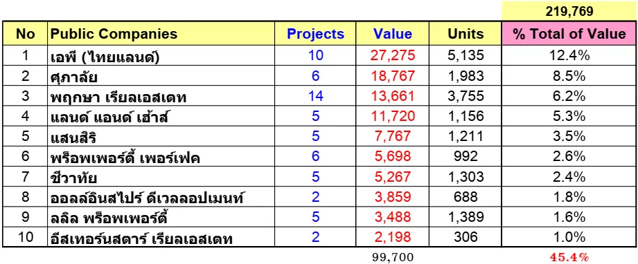 พิจารณาจำนวนมูลค่าของบริษัทมหาชน ในตลาดหลักทรัพย์ จะพบว่า บริษัท เอพี (ไทยแลนด์) จำกัด (มหาชน) มีมูลค่ามากที่สุด คือ 27,275 ล้านบาท รองลงมาคือ บริษัท ศุภาลัย จำกัด (มหาชน) มีมูลค่า 18,737 ล้านบาท และอันดับ 3 คือ บริษัท พฤกษา เรียลเอสเตท จำกัด (มหาชน) จำนวน 13,661 ล้านบาท ถ้าเทียบมูลค่าที่เปิดใหม่ทั้งหมดครึ่งปีแรก 2562 คือ 219,769 ล้านบาท ก็จะพบว่า 3 บริษัทนี้เปิดตัวเป็นสัดส่วน 12.4%, 8.5% และ 6.2% ตามลำดับ
