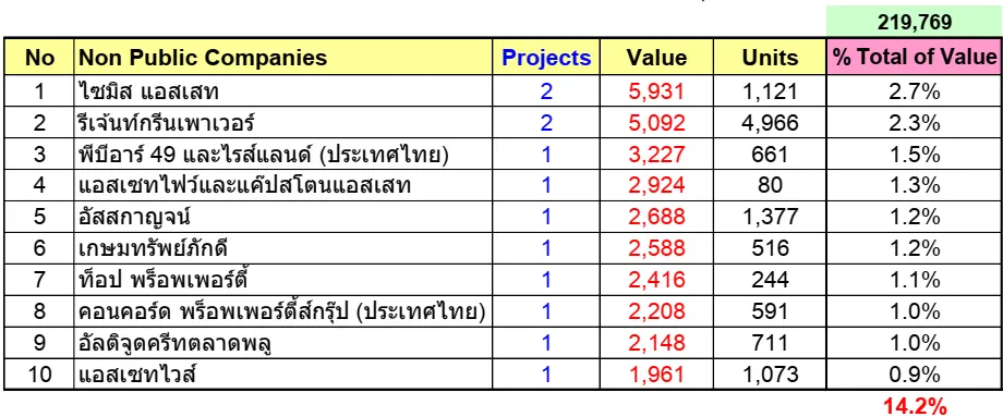 พิจารณาจำนวนมูลค่าของบริษัทจำกัด จะพบว่า บริษัท ไซมิส แอสเสท จำกัด มีมูลค่ามากที่สุด คือ 5,931 ล้านบาท รองลงมาคือ บริษัท รีเจ้นท์ กรีนพาวเวอร์ จำกัด มีมูลค่า 5,092 ล้านบาท และอันดับ 3 คือ บริษัท พีบีอาร์ 49 และไรส์แลนด์ (ประเทศไทย) จำกัด จำนวน 3,227 ล้านบาท ถ้าเอาจำนวนรวมมูลค่าที่เปิดใหม่ครึ่งปีแรก 2562 คือ 219,739 ล้านบาท ก็จะพบว่า 3 บริษัทนี้เปิดตัวเป็นสัดส่วน 2.7%, 2.3% และ 1.5% ตามลำดับ