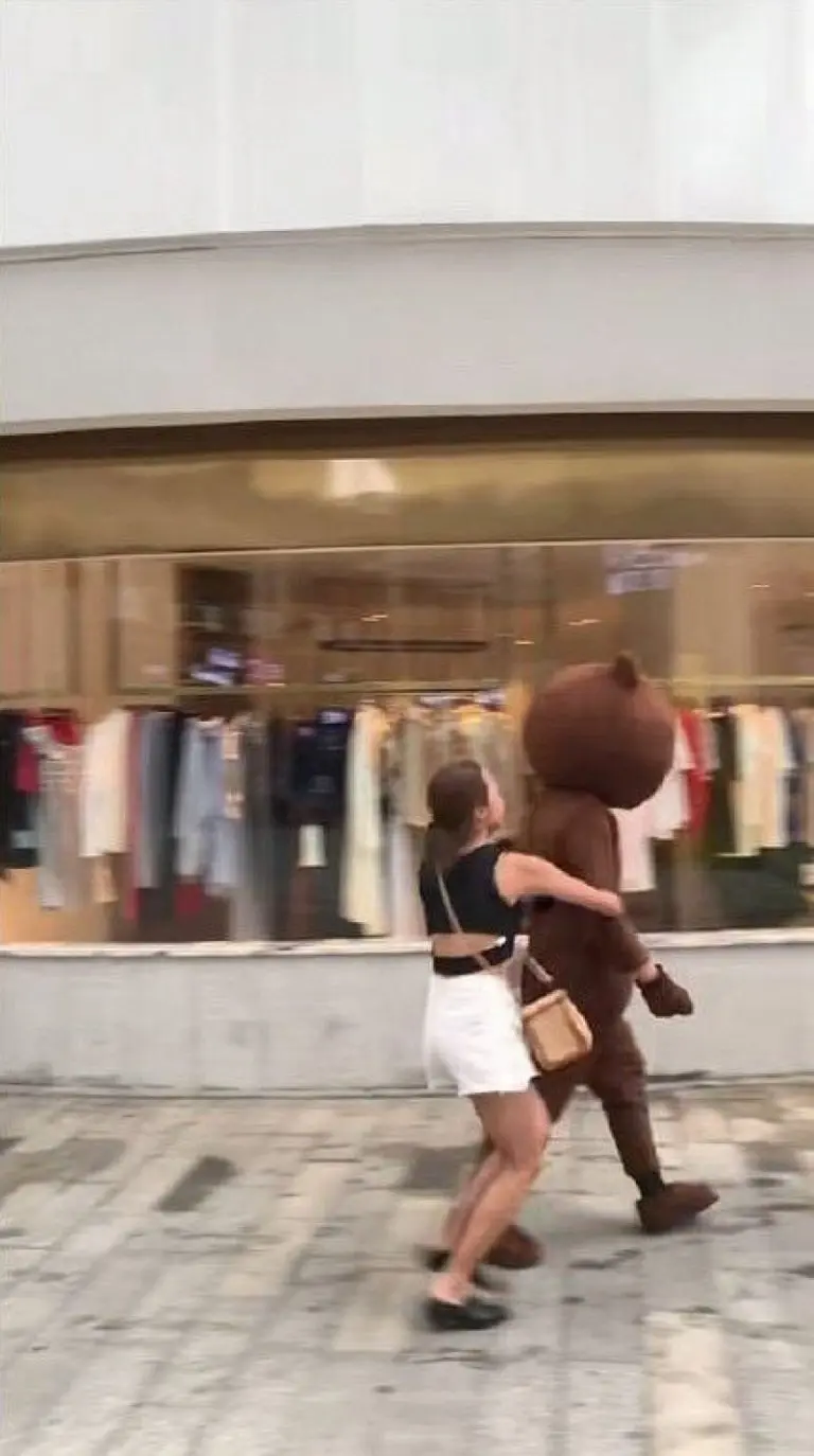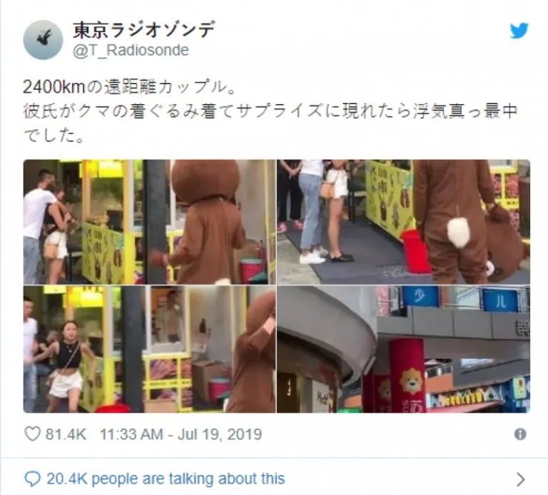 ชายคนที่อยู่ในภาพเดินทางมากว่า 2,400 กิโลเมตร เพื่อจะมาเซอร์ไพรส์แฟนด้วยการสวมชุดมาสคอตหมี แต่ว่าเขากลับเจอเซอร์ไพรส์ยิ่งกว่า นั่นคือแฟนสาวของเขาอยู่ในอ้อมแขนของชายอีกคนหนึ่ง