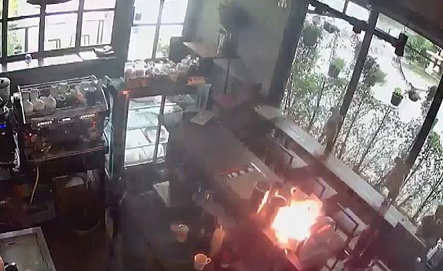 ภาพจากกล้องวงจรปิดภายในร้านกาแฟสดชื่อ มีคาเฟอีน ตั้งอยู่ริมถนนพระยาสัจจา ตำบลเสม็ด อำเภอเมือง จังหวัดชลบุรี บันทึกเหตุการณ์ขณะที่ลำโพงบลูทูธเกิดการระเบิดแล้วมีแสงไฟลุกไหม้เป็นวงกว้างบนเค้าท์เตอร์ขณะเสียบไฟชาร์ตแบตเตอรี่ทิ้งไว้ ยังเคราะห์ดีที่ไม่ลุกลาม โดยเกิดขึ้นเมื่อช่วงเวลาบ่ายของวันที่ 19 ก.ค. ที่ผ่านมา