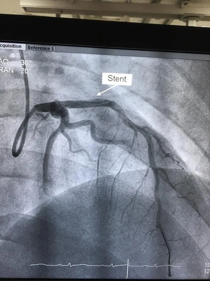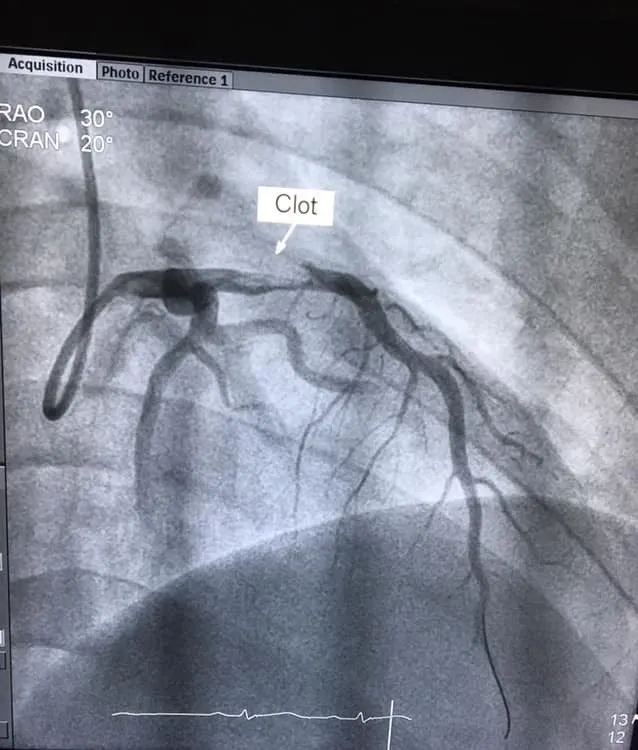 ฉีดสีหลอดเลือดหัวใจพบลิ่มเลือดอุดตันหลอดเลือดด้านซ้าย ได้รับการทำบอลลูนใส่ขดลวด
