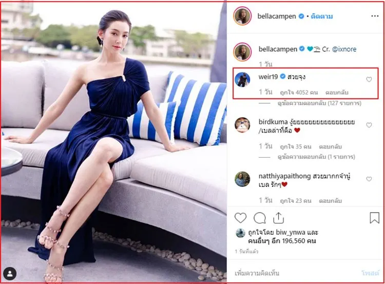ล่าสุด เบลล่า ได้โพสต์ภาพลงอินสตราเเกรมให้แฟนๆได้ติดตามกัน แต่งานนี้หนึ่งในนั้นคือ หนุ่มเวียร์ ที่จะเห็นว่าจะเป็นเเฟนคลับตัวจริงของ สาวเบลล่า เพราะเข้ามาคอมเมนต์ชมว่า สวยจุง ต้องบอกเลยว่านาทีนี้มีเเต่คนอิจฉาสาวเบลล่าเพราะพี่เวียร์ทั้งชมเก่งเเละดูเเละเก่งขนาดนี้ ทำเอาแฟนคลับฟินไปตามๆกัน