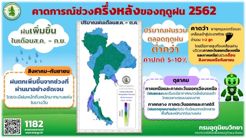 วันที่ 24 กรกฎาคม 2562 เว็บไซต์กรมอุตุนิยมวิทยาเผยแพร่พยากรณ์การคาดหมายสภาพอากาศช่วงครึ่งปีหลังของหน้าฝนนี้ เผย ภายในเดือนสิงหาคมหรือกันยายนจะมีพายุฤดูหมุนเขตร้อนถล่มไทย 1-2 ลูกด้วยกัน