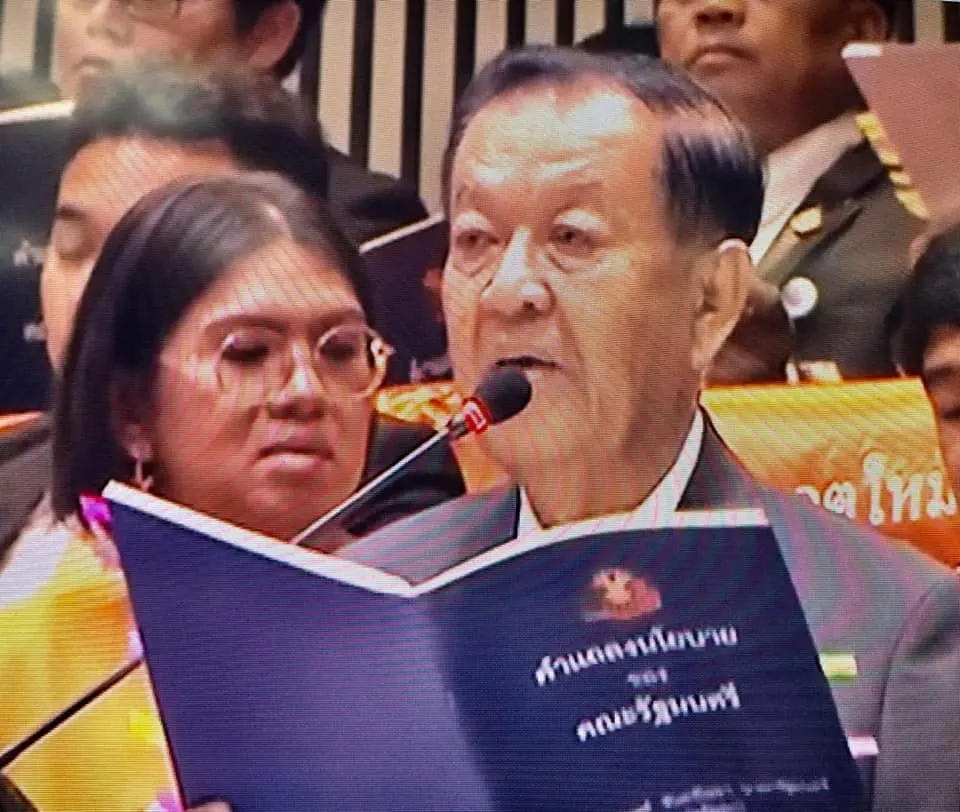 "ท่านนายกฯ บอกว่าจะยึดมั่นการปกครองในระบอบประชาธิปไตยอันมีพระมหากษัตริย์ทรงเป็นประมุข คำว่ายึดมั่นต้องเป็นคนที่มีความศรัทธา ถ้าท่านประธานรัฐสภาเขียนไว้ให้พวกผมฟัง ผมก็จะเชื่อ เพราะท่านไม่เคยปฏิวัติ ไม่เคยทำรัฐประหาร แต่คนที่เคยทำปฏิวัติซ้ำซาก อย่างน้อยก็สองครั้ง จะมาบอกว่ายึดมั่นในระบอบประชาธิปไตยได้อย่างไร