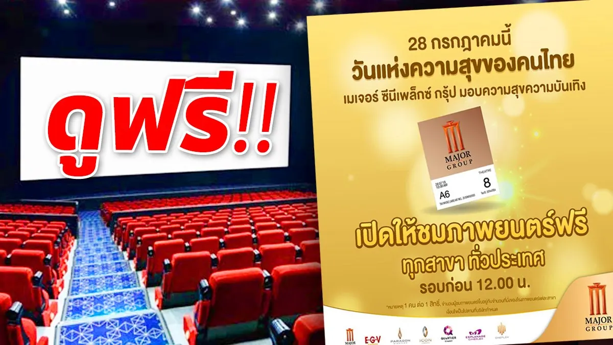 โดยทางเฟซบุ๊กแฟนเพจ เมเจอร์ กรุ๊ป ระบุว่า 28 กรกฎาคมนี้ วันแห่งความสุขของคนไทยเมเจอร์ ซีนีเพล็กซ์ กรุ้ป ร่วมมอบความสุขความบันเทิง เปิดให้ประชาชนชมภาพยนตร์ระบบปกติฟรี1 คน 1 สิทธิ์ ทุกสาขาทั่วประเทศ รอบก่อน 12.00 น. ที่โรงภาพยนตร์ในเครือเมเจอร์ กรุ้ป
