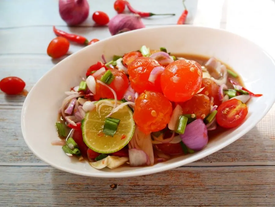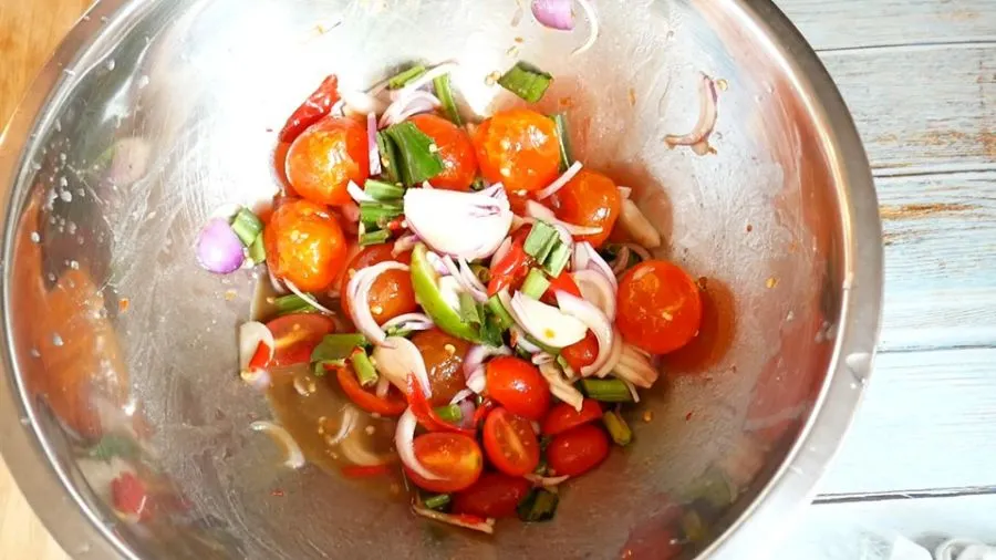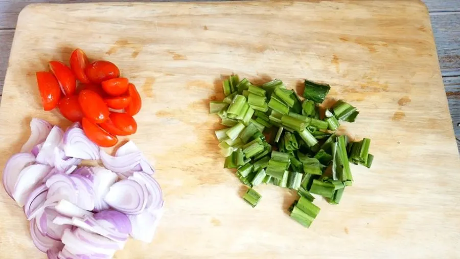 5.ซอยหอม หั่นมะเขือเทศ และซอยผักชี