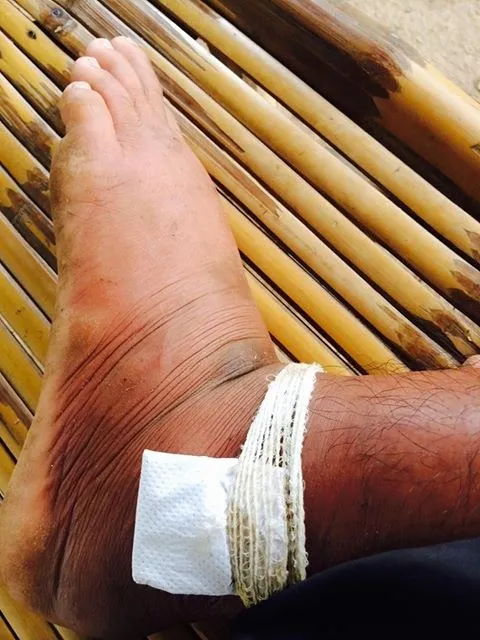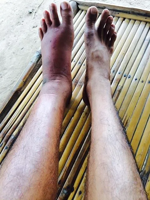 แต่พอกลับถึงบ้านตอนเย็นเท้าเริ่มบวมตรงบริเวณแผลที่เกา พอถึงเช้าเท้าเริ่มบวมลามมาถึงหลังเท้าและบวมขึ้นเรื่อยๆ ตอนนี้ก็ยังไม่ไปหาหมอนะซื้อยาแก้ปวดมากินเองประคบสมุนไพรเอง เป็นได้อยู่ 4วัน เริ่มไม่ไหวแล้วอาการบวมลามมาถึงหน้าแข้งแล้ว เวลาเรายืนหรือเอาเท้าลงต่ำจะปวดมากเวลานั่งต้องนั่งชันเขาจึงจะหายปวด วันที่5เลยตัดสินใจไปโรงพยาบาล เพราะตอนนั้นมีข่าวว่ามีหนุ่มคนนึงโดนแมงมุมกัดแล้วต้องตัดขา กลัวโดนตัดขาเหมือนกัน