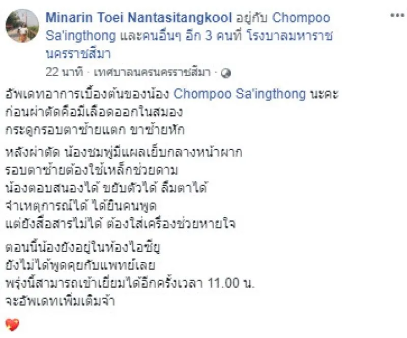 ล่าสุด ในเฟซบุ๊ก Minarin Toei Nantasitangkool โพสต์ข้อความระบุว่า อัพเดทอาการเบื้องต้นของน้อง Chompoo Sa'ingthong นะคะ ก่อนผ่าตัดคือมีเลือดออกในสมอง กระดูกรอบตาซ้ายแตก ขาซ้ายหักหลังผ่าตัด น้องชมพู่มีแผลเย็บกลางหน้าผาก รอบตาซ้ายต้องใช้เหล็กช่วยดาม น้องตอบสนองได้ ขยับตัวได้ ลืมตาได้ จำเหตุการณ์ได้ ได้ยินคนพูดแต่ยังสื่อสารไม่ได้ ต้องใส่เครื่องช่วยหายใจตอนนี้น้องยังอยู่ในห้องไอซียู ยังไม่ได้พูดคุยกับแพทย์เลยพรุ่งนี้สามารถเข้าเยี่ยมได้อีกครั้งเวลา 11.00 น.จะอัพเดทเพิ่มเติมจ้า