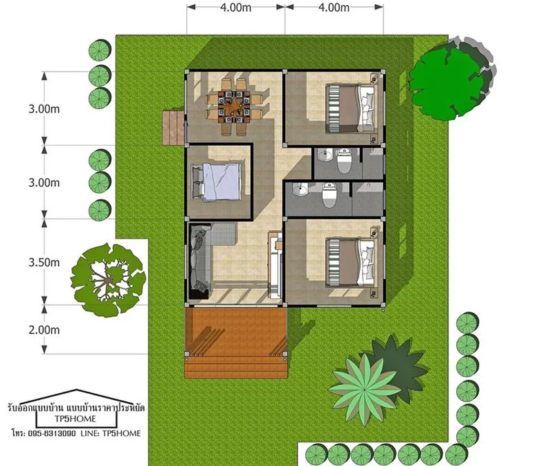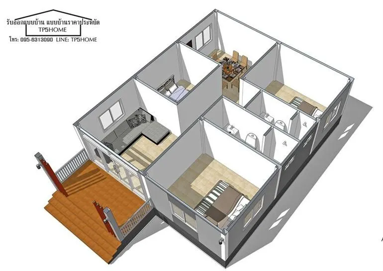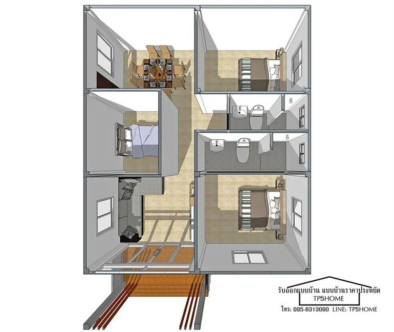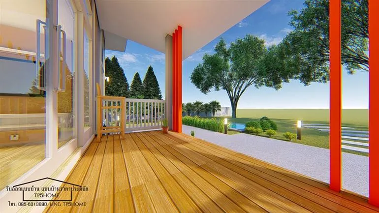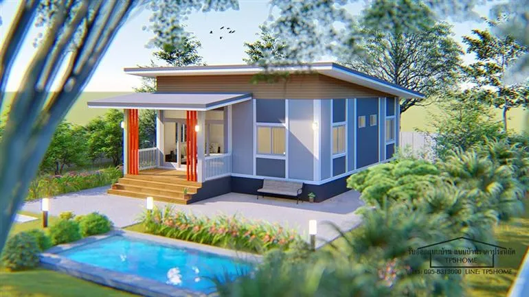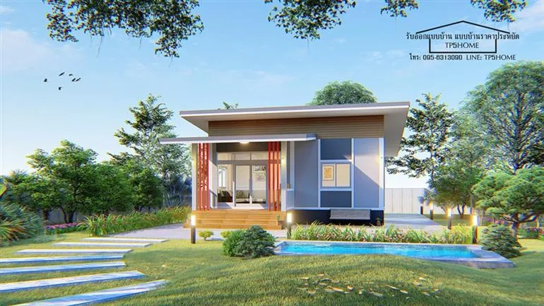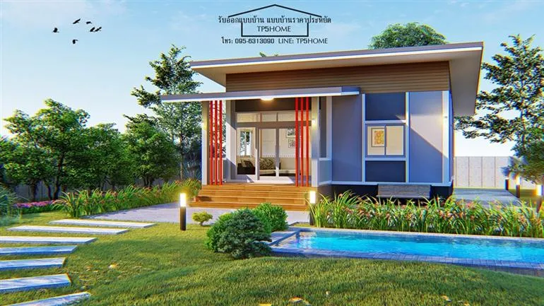 โดยแบบบ้านสวยๆ ของเราในวันนี้ยังคงได้รับการสนับสนุนจากเพจ Tp5home เช่นเคยครับ เพจนี้รับออกแบบบ้านและจำหน่ายแบบบ้านราคาประหยัดใครสนใจไปติดต่อกันได้นะจะให้ข้อมูลการติดต่อไว้ด้านล่าง ส่วนแบบบ้านที่นำมาให้ชมกันในวันนี้ เป็นบ้านชั้นเดียวทรงโมเดิร์นสมัยใหม่ ดีไซน์ภายนอกมาในแบบหลังคาเพิงหมาแหงนแนวร่วมสมัย ออกแบบให้มีระเบียงเล็กๆ ไว้สำหรับนั่งเล่นพักผ่อนในครอบครัวบริเวณหน้าบ้าน ทันสมัยด้วยสีสันในแบบหลายโทน ตัวบ้านเป็นทรงกรอบสี่เหลี่ยมง่ายๆ มีขนาด 3 ห้องนอน 2 ห้องน้ำ 1 ห้องรับแขก 1 ห้องครัว