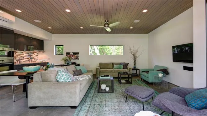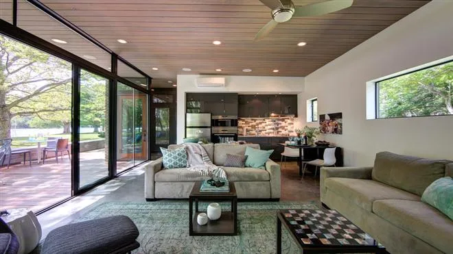 แบบบ้านที่ออกแบบมาให้เป็นสี่เหลี่ยมผืนผ้าชั้นเดียวง่ายๆ ยกพื้นเล็กน้อย เพิ่มความสวยงามด้านนอกด้วยการแต่งไม่เรียงเป็นแนว ทำให้ตัวบ้านดูโดดเด่รนไม่ธรรมดา ส่วนด้านของบ้านนั้นมีระเบียงไว้นั่งเล่น ประตูหน้าเป็นแบบกระจกบ้านใหญ่ เพอ่มความโปร่งโล่งสบาย