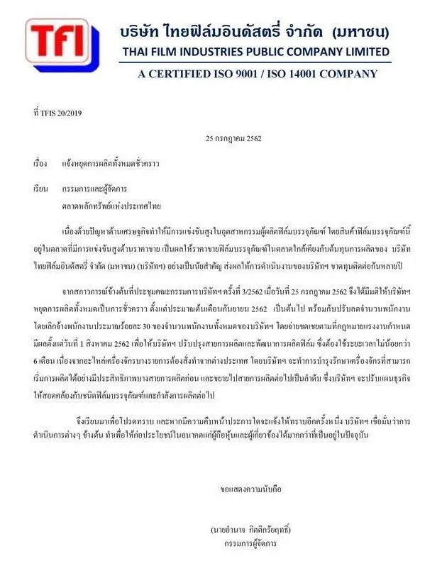 บริษัท ไทยฟิล์มอินดัสตรี่ จำกัด (มหาชน) หรือ TFI ผู้ผลิตฟิล์มบรรจุภัณฑ์ แจ้งต่อตลาดหลักทรัพย์แห่งประเทศไทยว่า ที่ประชุมประชุมคณะกรรมการบริษัทฯ เมื่อวันที่ 25 กรกฎาคม 2562 มีมติหยุดการผลิตทั้งหมดเป็นการชั่วคราว ตั้งแต่ต้นเดือนกันยายน 2562 เป็นต้นไป พร้อมปรับลดจำนวนพนักงานร้อยละ 30 ของจำนวนทั้งหมด โดยจ่ายค่าชดเชยตามที่กฎหมายแรงงานกำหนดมีผลตั้งแต่วันที่ 1 สิงหาคม 2562 เพื่อให้บริษัทฯ ปรับปรุงสายการผลิตและพัฒนาการผลิตฟิล์ม ซึ่งต้องใช้ระยะเวลาไม่น้อยกว่า 6 เดือน เพราะอะไหล่เครื่องจักรบางรายการต้องสั่งทำจากต่างประเทศ