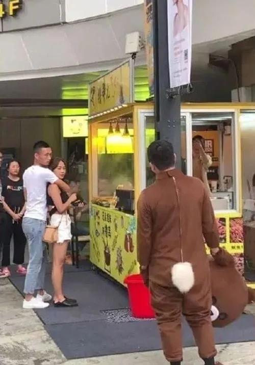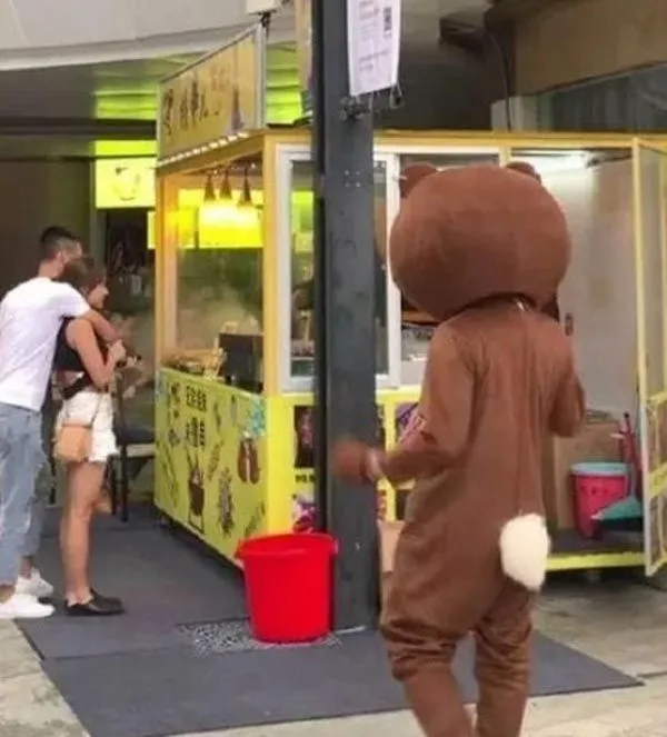โดย เว็บไซต์เวิลด์ออฟบัซ หยิบยกเรื่องราวนี้มาเปิดเผยว่า เมื่อวันที่ 22 กรกฎาคม 2562 เผยว่า ผู้ใช้บัญชีทวิตเตอร์รายหนึ่ง ได้แชร์ภาพของชายหนุ่มขณะสวมชุดหมีสีน้ำตาล ไปยืนอยู่ที่บริเวณลานด้านนอกของศูนย์การค้าแห่งหนึ่งในประเทศจีน เพื่อเตรียมจะเซอร์ไพรส์วันเกิดให้แฟนสาว แต่ภาพที่เห็นด้านหน้าคือ มีชายอื่นกำลังยืนกอดคอแฟนสาวของตนเองอยู่
