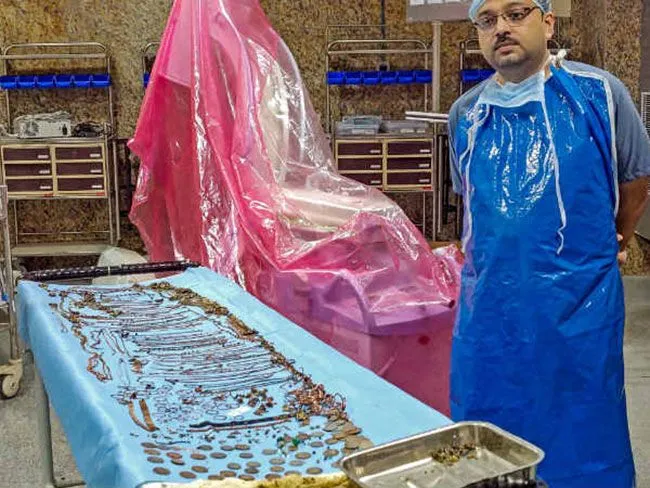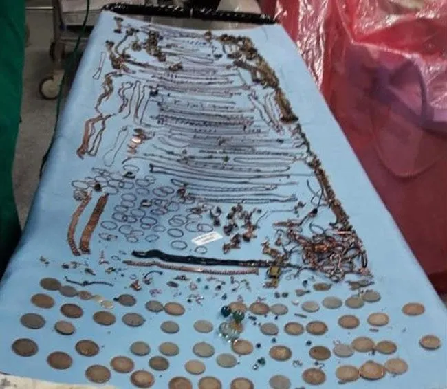 ข้าวของที่พบในท้องของคนไข้รายนี้ ประกอบไปด้วย ต่างหู 80 ชิ้น สร้อยเส้นยาว 69 เส้น เหรียญ 46 เหรียญ ห่วงจมูก 11 ชิ้น ล็อกเก็ต 8 อัน สร้อยข้อเท้า 5 เส้น กุญแจ 4 ดอก และนาฬิกา 1 เรือน รวมทั้งหมด 224 ชิ้น