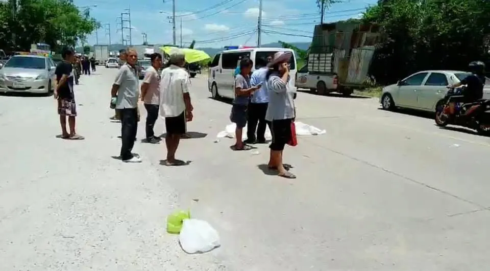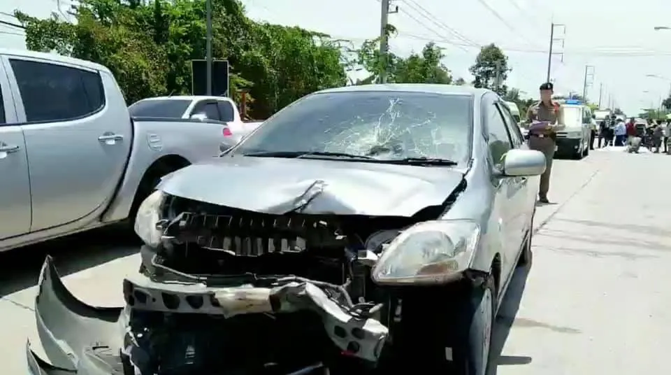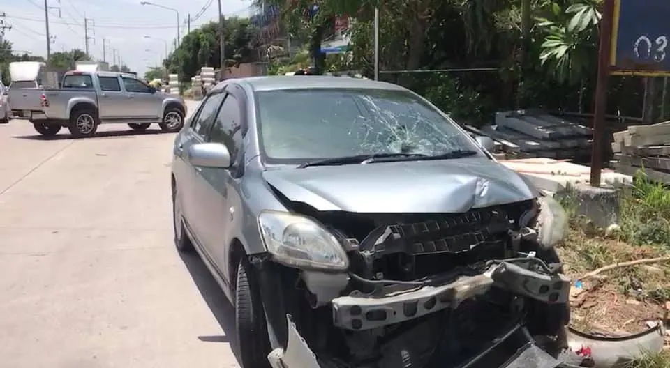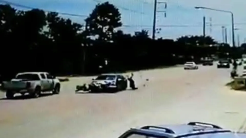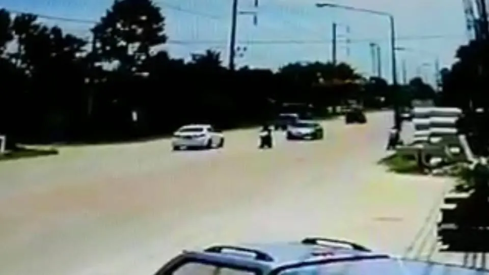 นี่คือภาพจากกล้องวงจรปิด บริเวณริมถนนสายบ้านบึง – พานทอง หมู่ที่ 3 ตำบลบ้านบึง อำเภอบ้านบึง จังหวัดชลบุรี จับภาพรถจักรยานยนต์ ซึ่งมีหญิงมีอายุ กำลังจอด ที่จะกลับรถ และระหว่างนั้น ก็ได้มีรถยนต์เก๋ง สีบอร์น วิ่งมาอย่างรวดเร็ว เข้าชนอย่างแรง จนทำให้ร่างกระเด็นสูง และตกลงมากระแทกกับพื้น