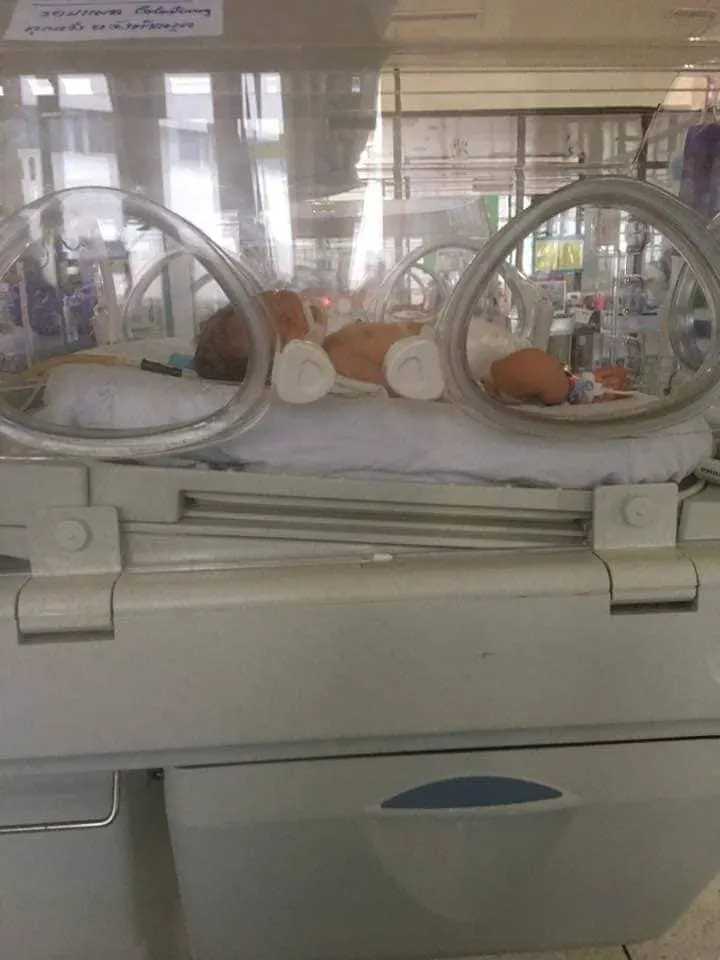 เราไม่ได้เจอลูกเลยจนวันที่ 2 พอเราพอนั่งได้เราขอให้พยาบาลพาเราไปหาลูกอีกรพนึง. เดินยังไม่ค่อยได้แต่ใจมันอยู่กับลูกแล้ว เราร้องไห้ตั้งแต่ เดินเข้าประตูแรก เห็นเค้านอนนิ่งๆในตู้ เหมือนใจเราแทบสลาย. ตอนนี้ คุณหมอบอกว่า. หัวใจไม่น่าเป็นห่วง เหลือสมองกับลำไส้ เท่านั้นที่รอผล. แต่ นิ้วโป้งเท้าน้องข้างซ้ายไม่มีกะดูก หมอบอกจะรักษาตามอาการ ตอนนี้ได้แต่ฝากความหวังกับหมอ. ได้แต่ภาวนาให้ลูกหายไวๆ