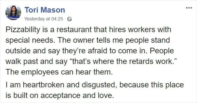 Pizzability ในเดนเวอร์ได้สร้รางความพิเศษ ระหว่างพนักงาน ก่อตั้งโดย Tiffany Fixter ซึ่งเป็นอดีตคุณครูที่เห็นความต้องการให้ชุมชนมีการฝึกอบรมสำหรับผู้ใหญ่ที่มีปัญหาทางร่างกายไม่สามารถช่วยเหลือตัวเองได้เท่าคนทั่วไป
